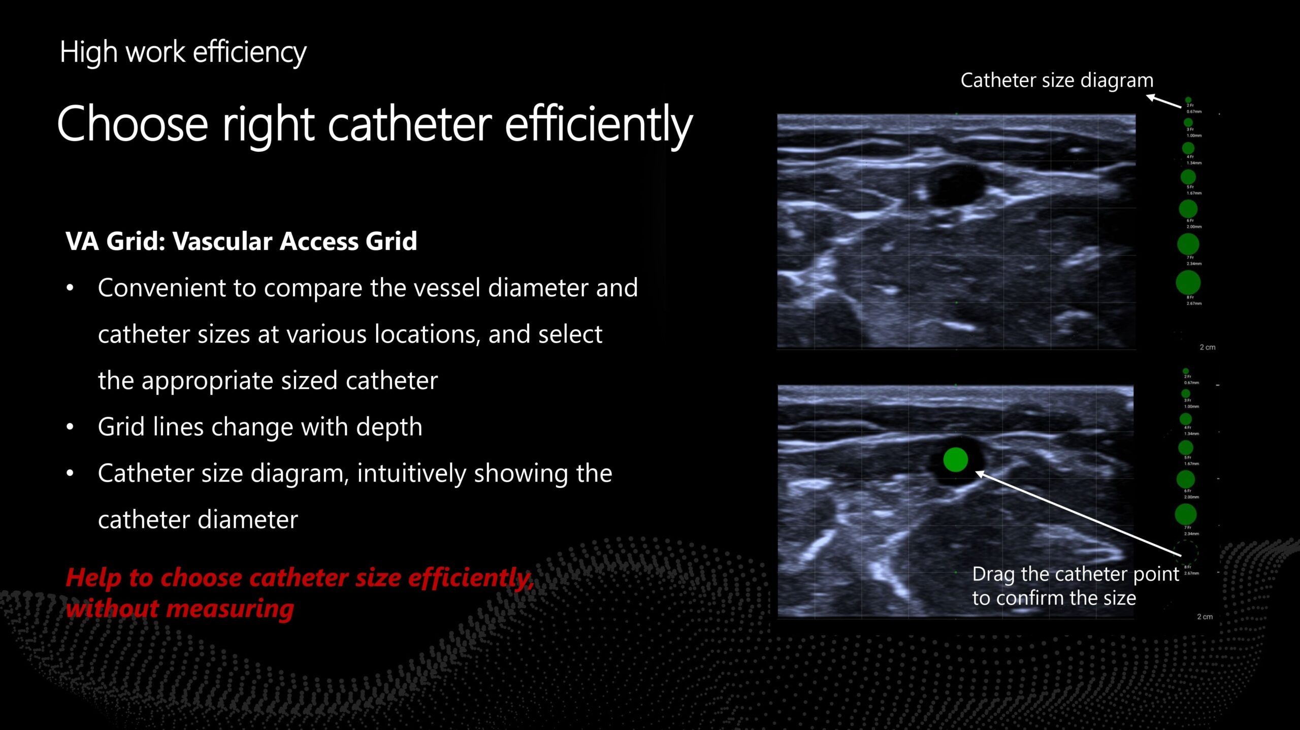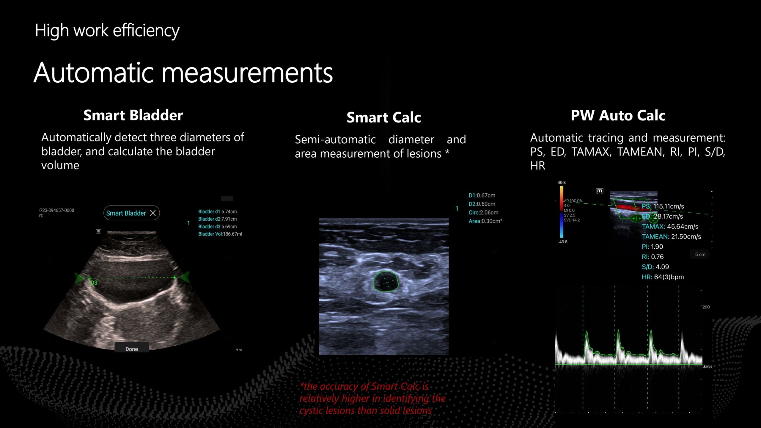 • Rileva automaticamente tre diametri della vescica e calcola il volume della vescica